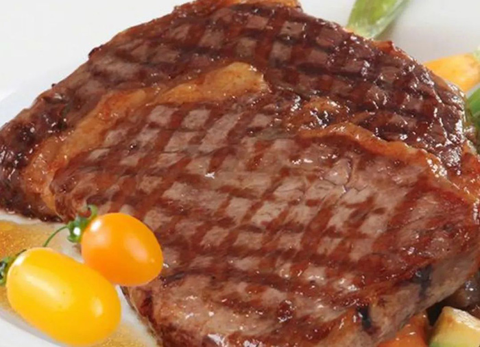 西冷牛排取自牛的上腰部位,屬于牛外脊肉。西冷牛排肉質(zhì)比較厚,脂肪含量比菲力牛排高,帶有大理石花紋,纖維略粗,有一定的結(jié)締組織和筋膜,彈性比較好。在肉的外延帶有一條白色肉筋。